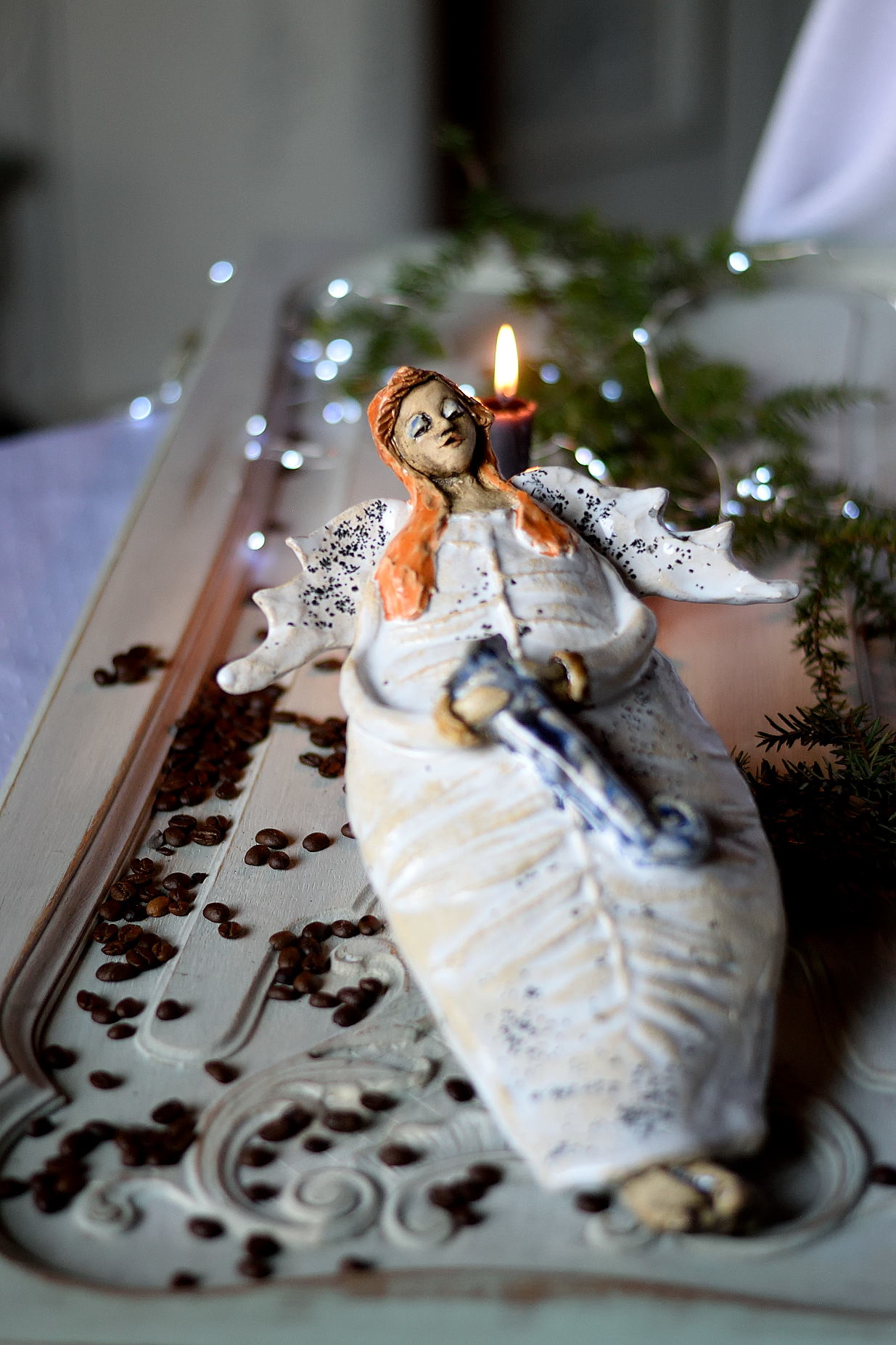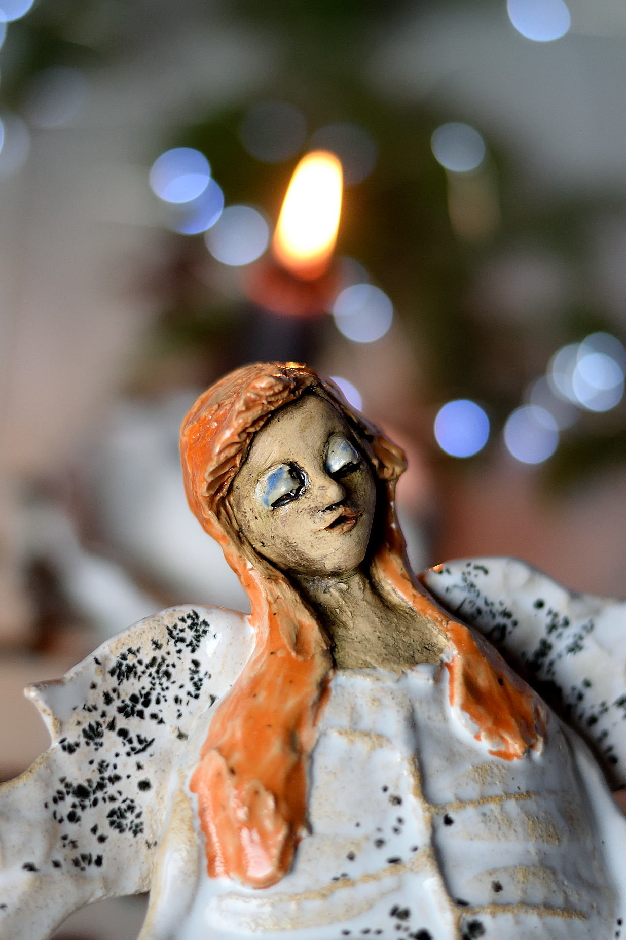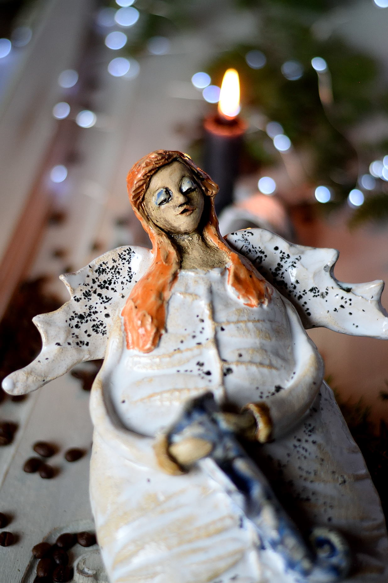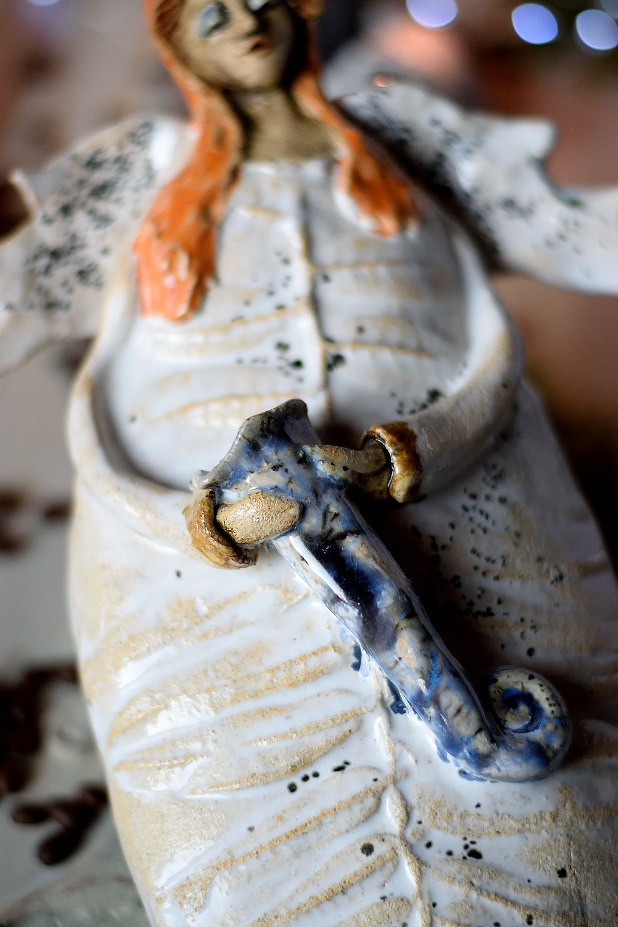 Dodaj swojemu wnętrzu bajkowego uroku dzięki temu ręcznie wykonanym aniołowi ceramicznemu. Ma pomarańczowe włosy, biały strój z niebieskimi akcentami i został zaprojektowany tak, aby idealnie prezentować się na ścianie.