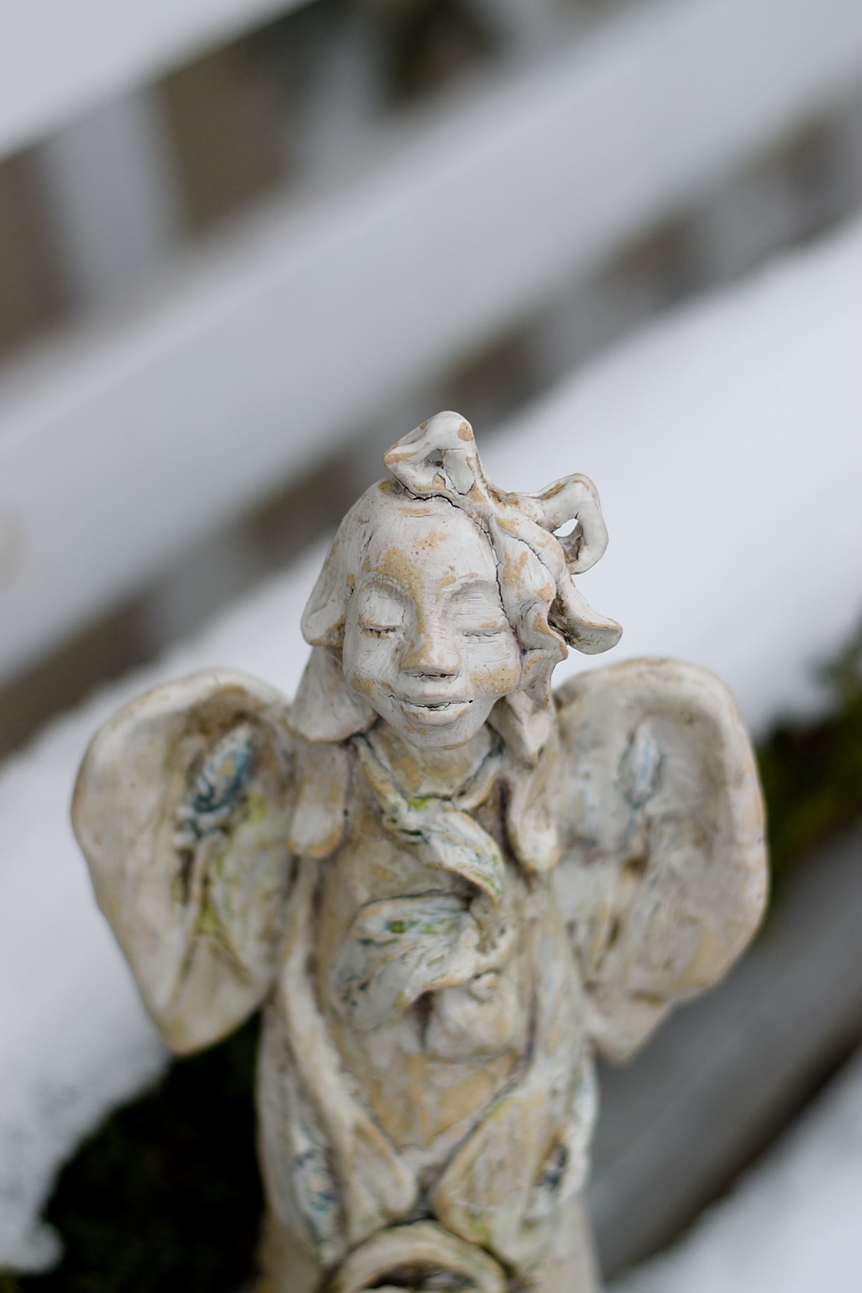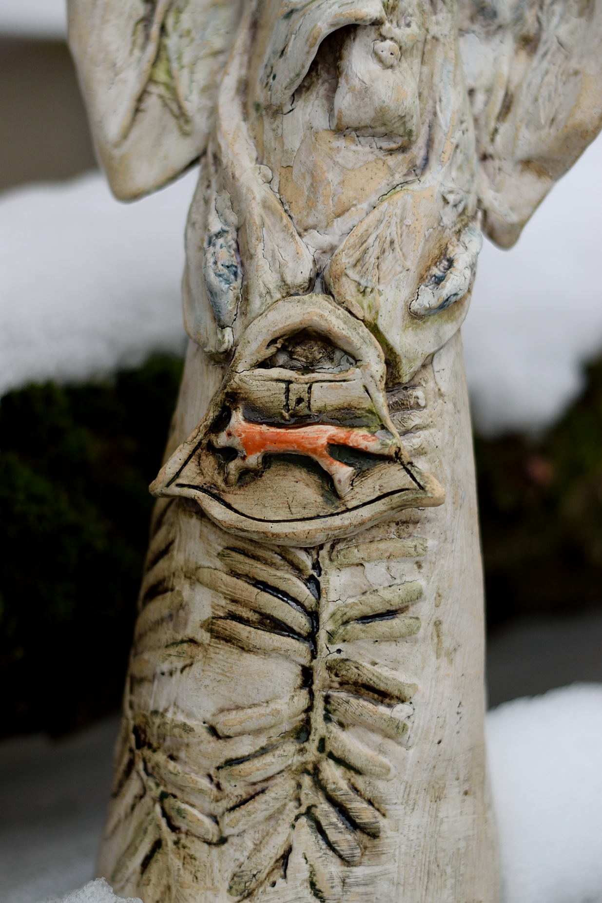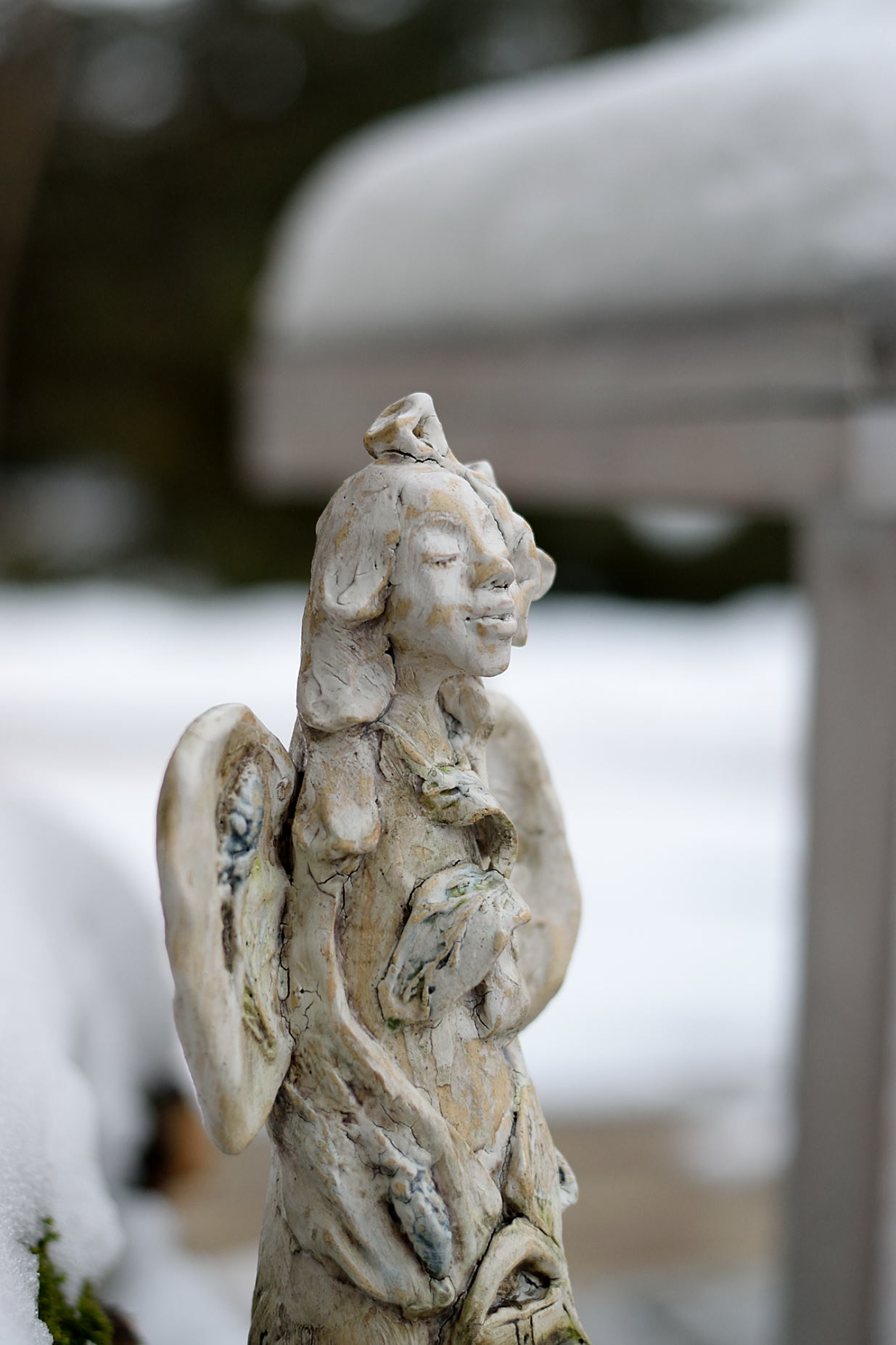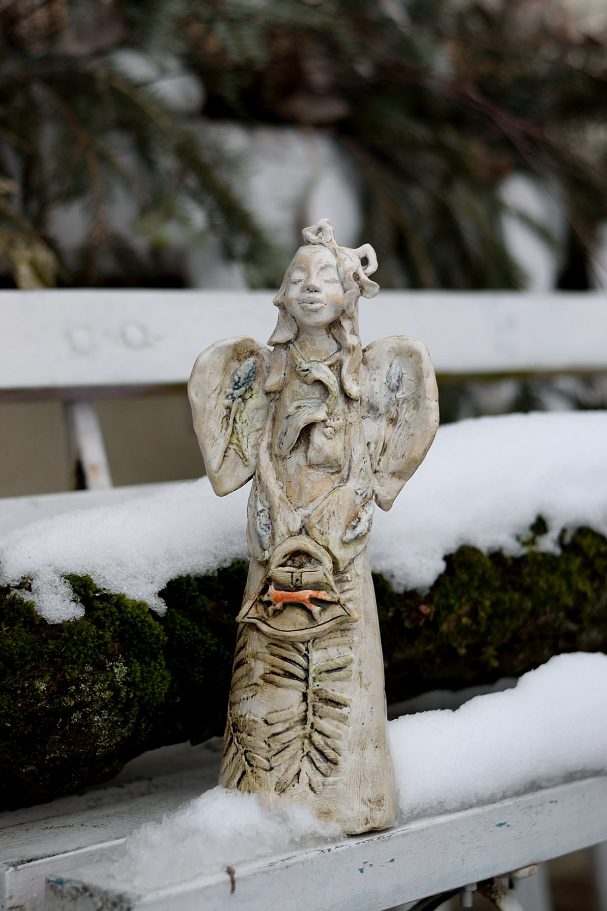 Figura ceramicznego anioła inspirowana otoczeniem lasu. Wszystkie motywy sugerują przejście anioła przez las. Przechadzają się zahaczył o paproć, przytulił lisa, i oczywiście zgarnął pachnącą lawendę, którą przyniósł na skrzydłach – dosłownie.