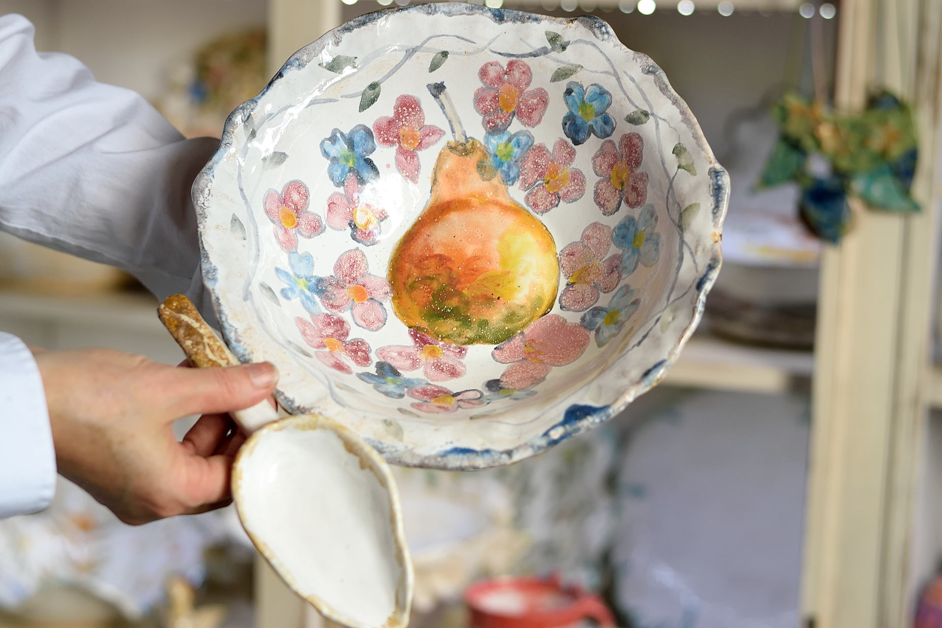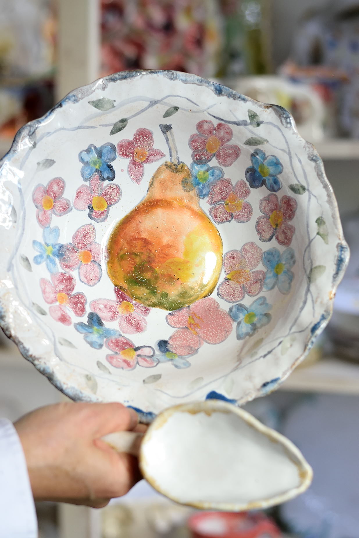 Duża misa ceramiczna ręcznie formowana i malowana gruszkę i hortensję.