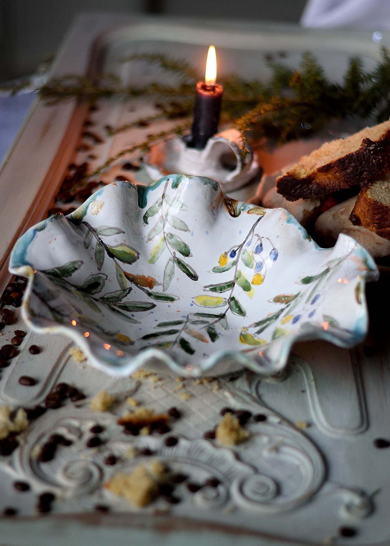- Szkliwiona na biało z kolorowymi, ręcznie malowanymi gałązkami.