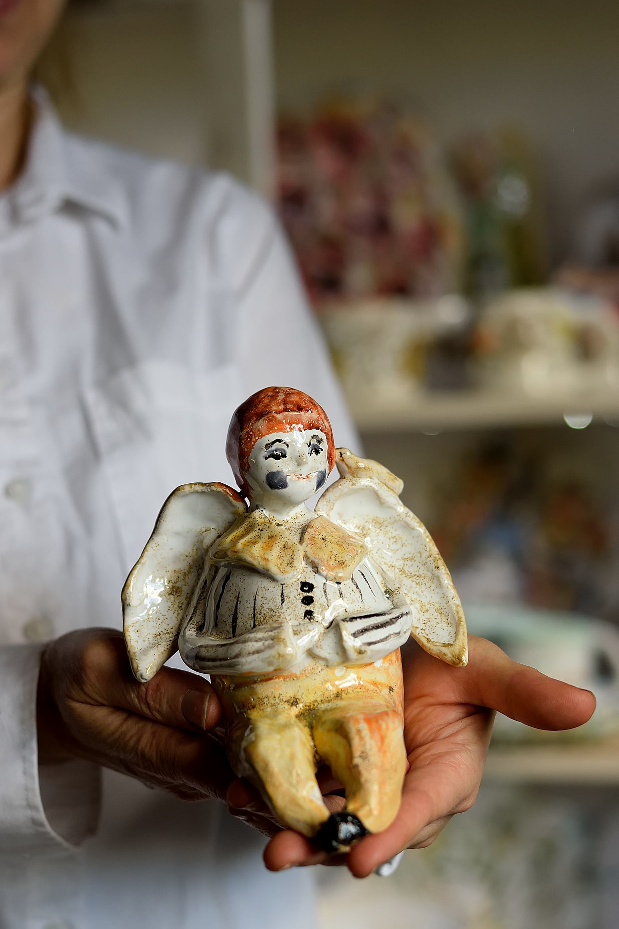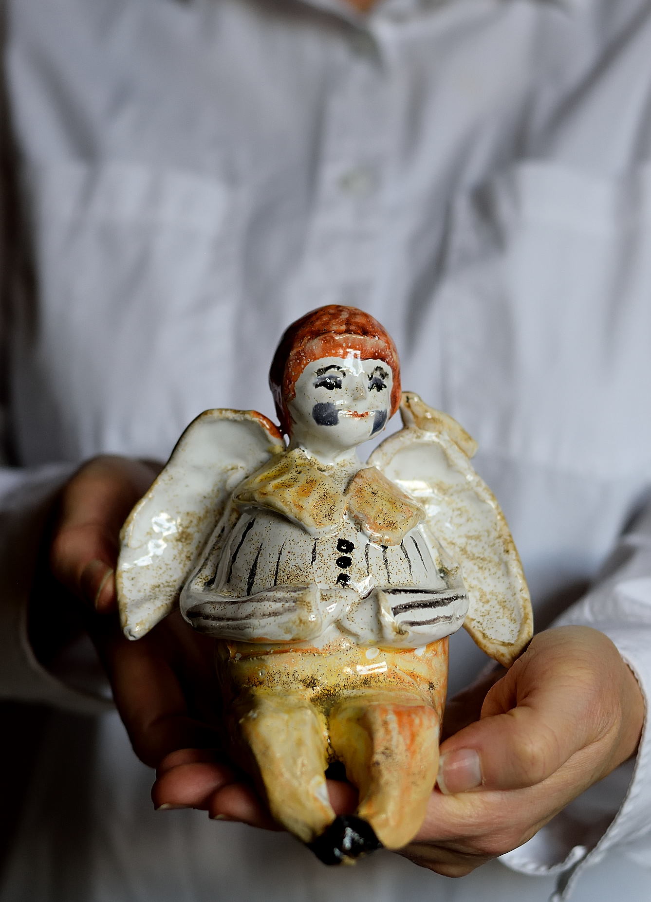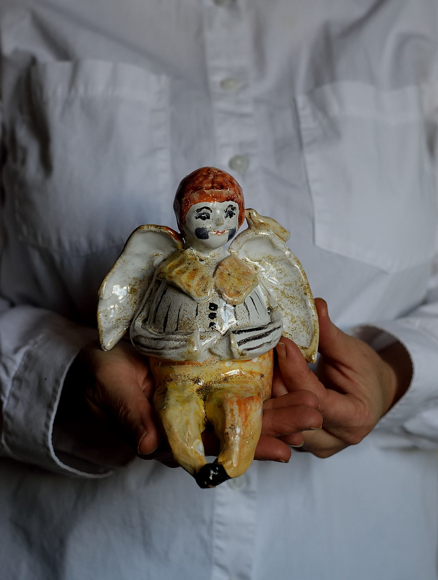 Ten mały, pękaty aniołek z ptaszkiem to prawdziwa perełka wśród świątecznych ozdób. Jego biało-żółte wykończenie nadaje całości lekkości i ciepła. Aniołek siedzi spokojnie, trzymając małego ptaszka – symbol radości, nadziei i spokoju.