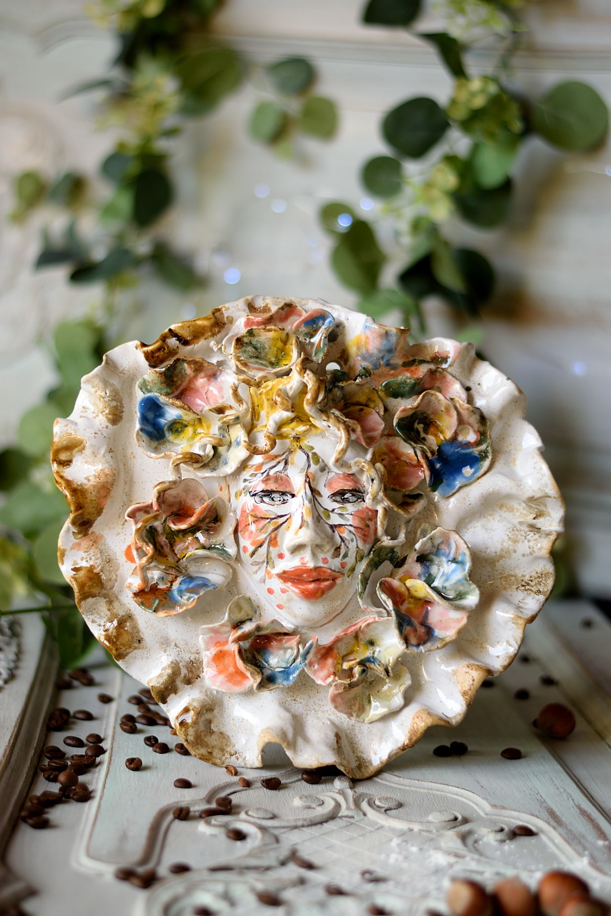 Unikalna, ręcznie wykonana maska do powieszenia na ścianie, ozdobiona wyjątkowym, wzorem w kwiaty. Praca w pełni ręczna, wypalona w piecu elektrycznym w temperaturze 1150°C, co zapewnia trwałość i wysoką jakość ceramiki. Idealny na ulubioną kawę lub herbatę, a także jako wyjątkowy prezent dla miłośników rękodzieła.