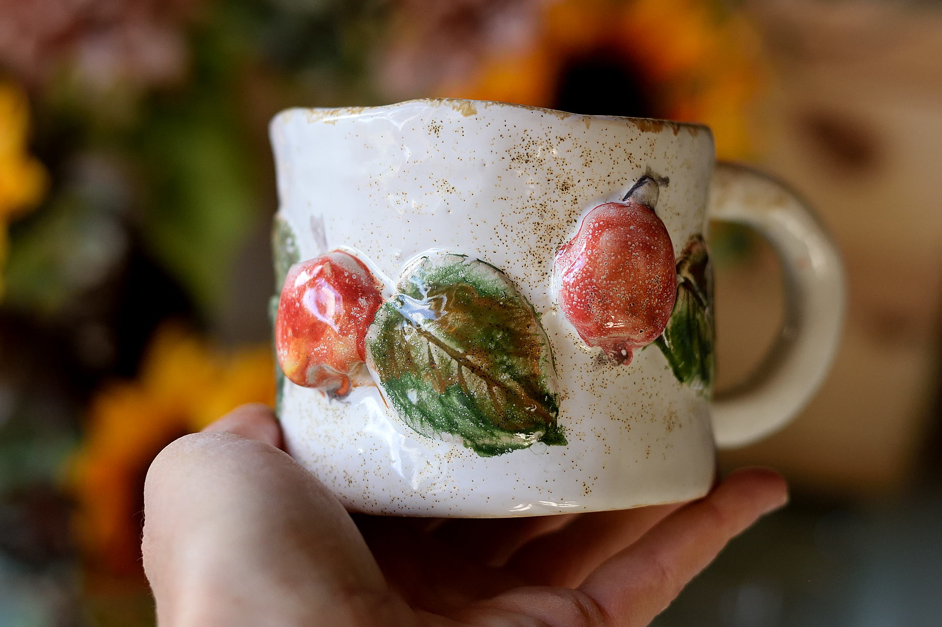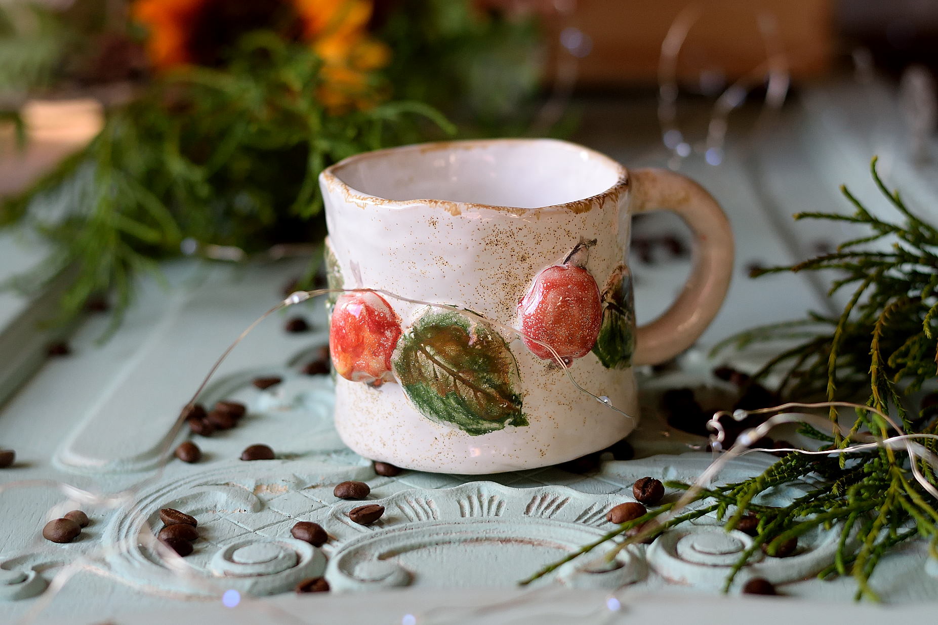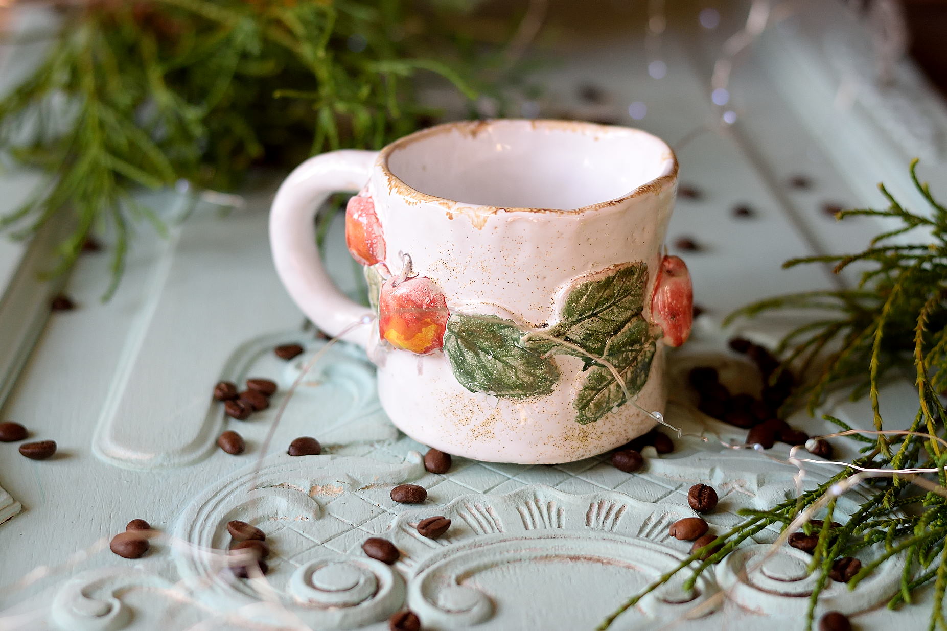 Ten ręcznie robiony kubek ceramiczny z pięknie wyrzeźbioną girlandą czerwonych jabłek to prawdziwa uczta dla oczu. Każdy egzemplarz powstaje z pasją, dzięki czemu jest wyjątkowy i unikatowy. Na kubku znajduje się trójwymiarowy, ręcznie wyrzeźbiony motyw, który dodaje mu niepowtarzalnego charakteru.
