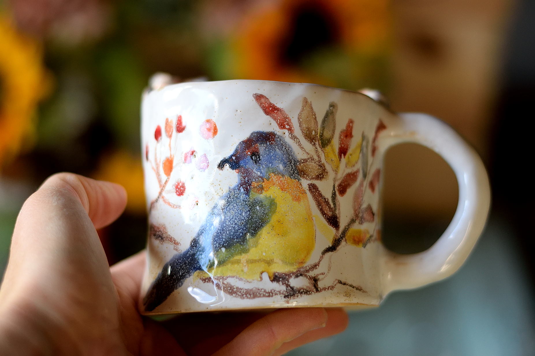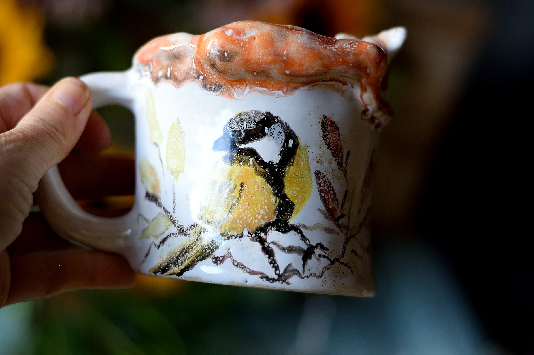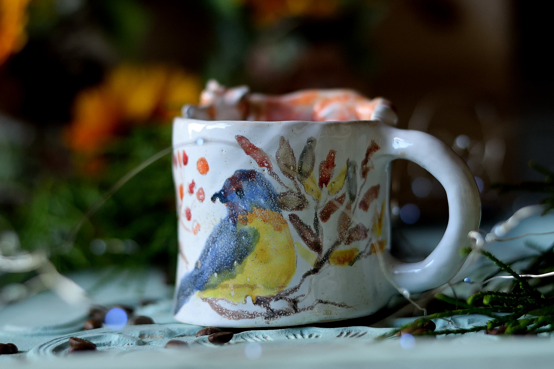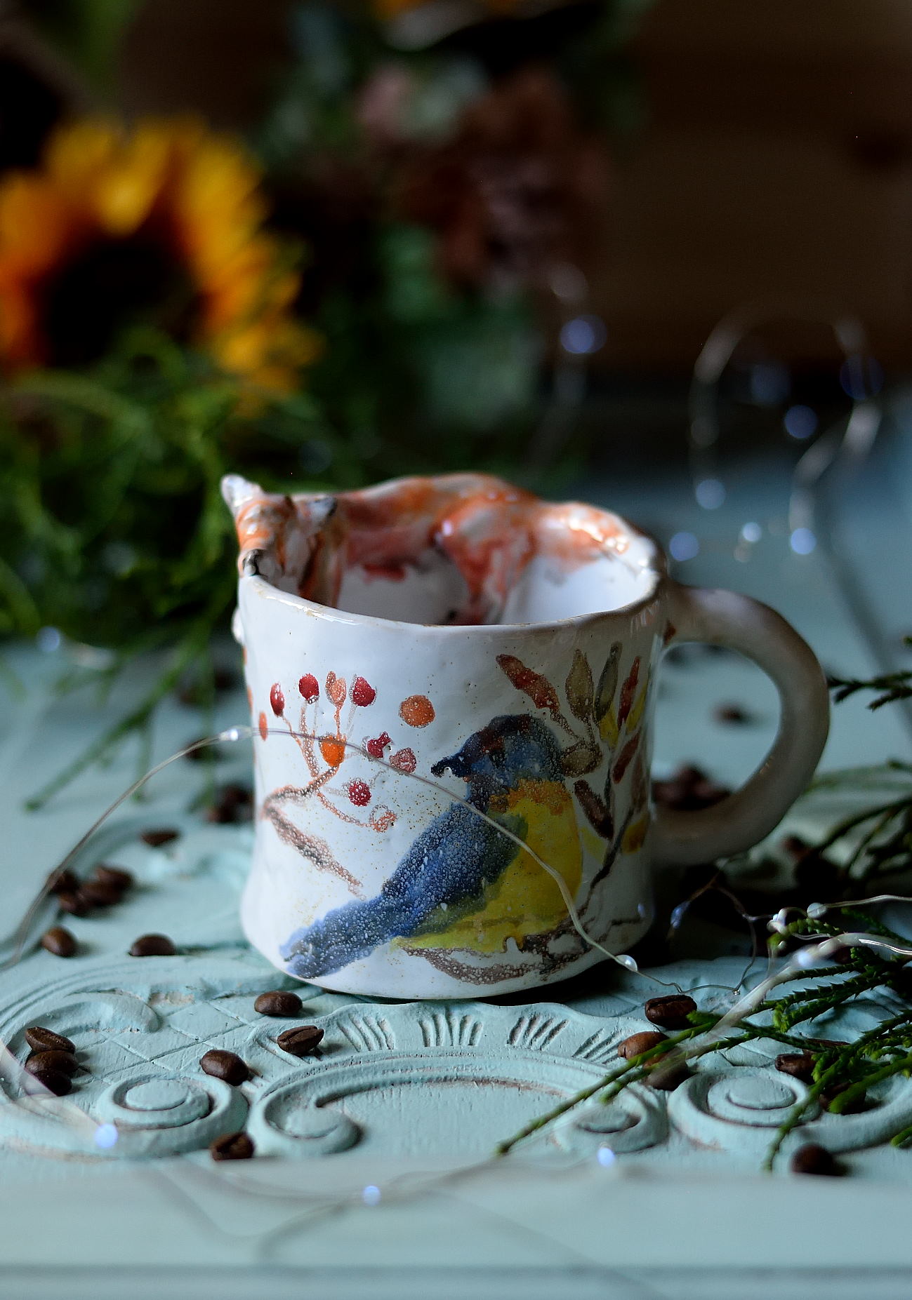 Na rancie kubka został ręcznie wyrzeźbiony lis, a jego powierzchnię zdobią ręcznie malowany ptaszek, który dodają całości uroku i charakteru.