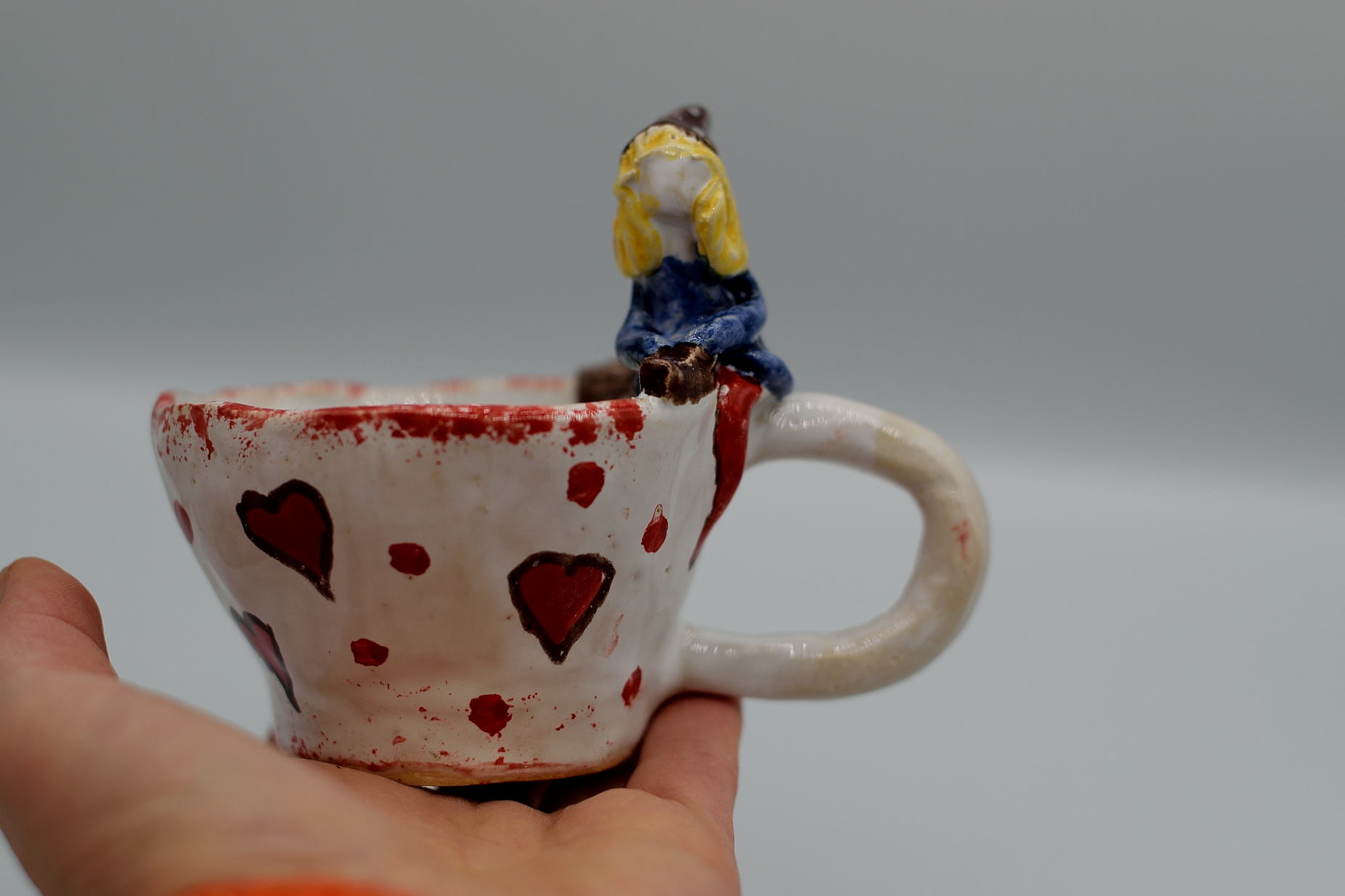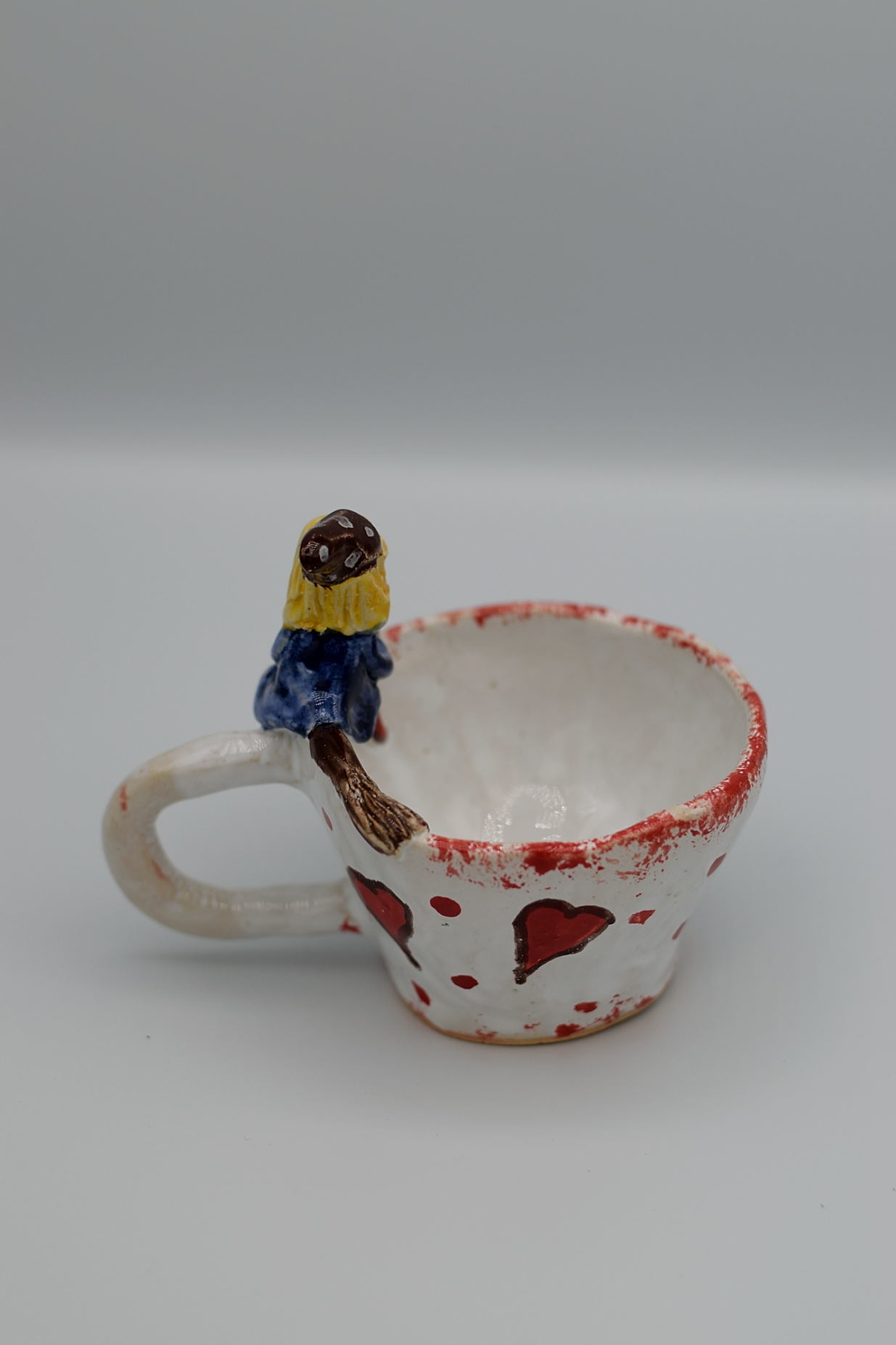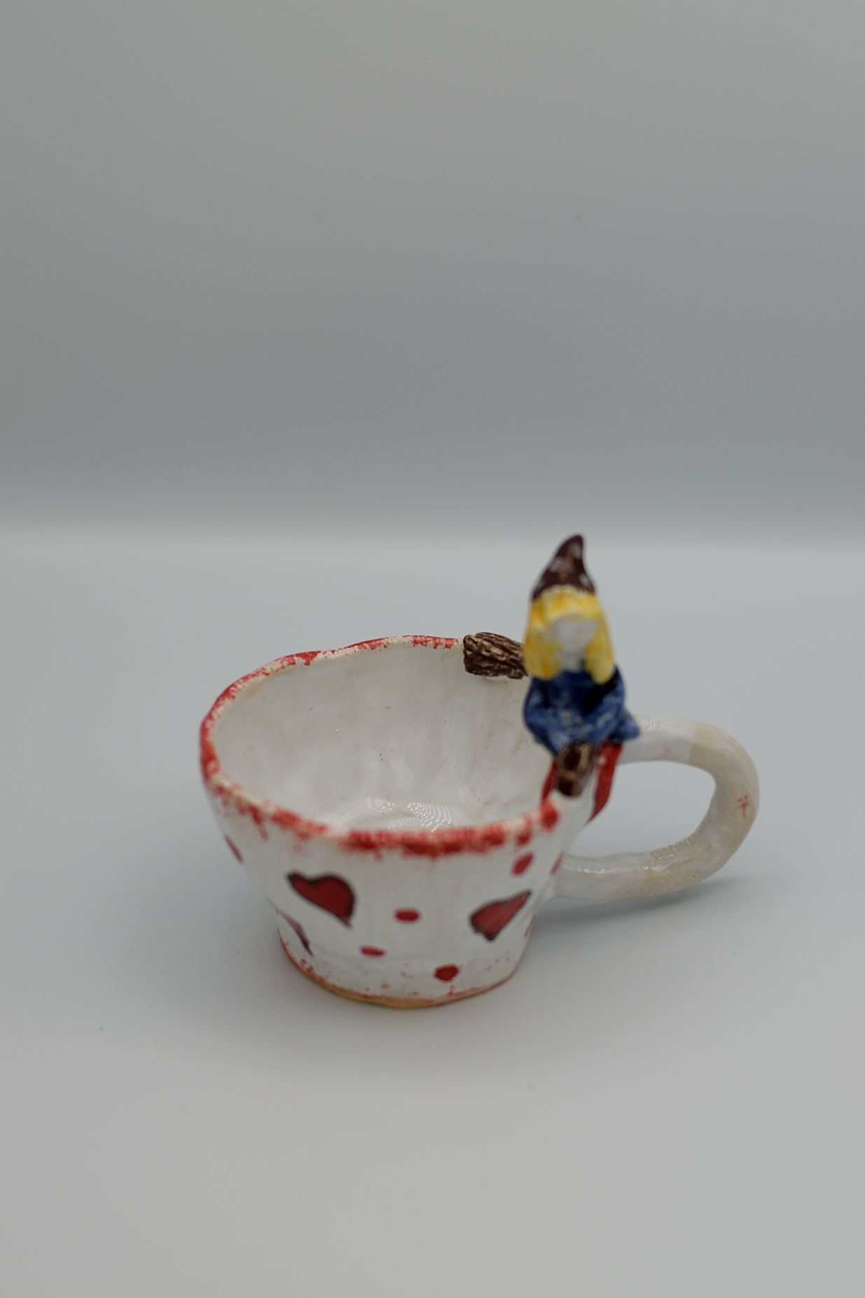 Kubek jest ręcznie formowany z gliny, co sprawia, że każdy egzemplarz jest niepowtarzalny. Kubek z zabawnym motywem czarownicy.
