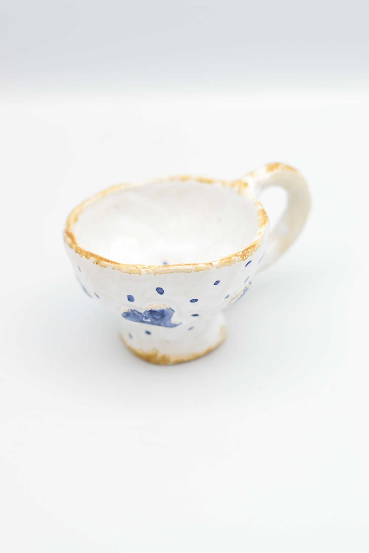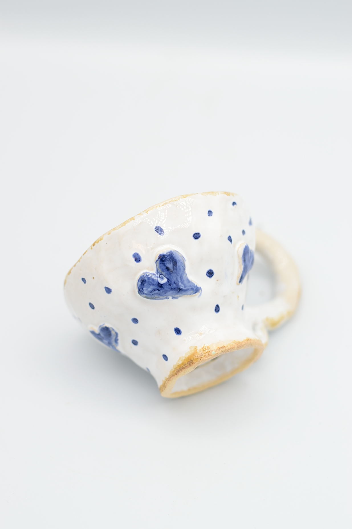 Mały, ceramiczny kubek z niebieskimi serduszkami.