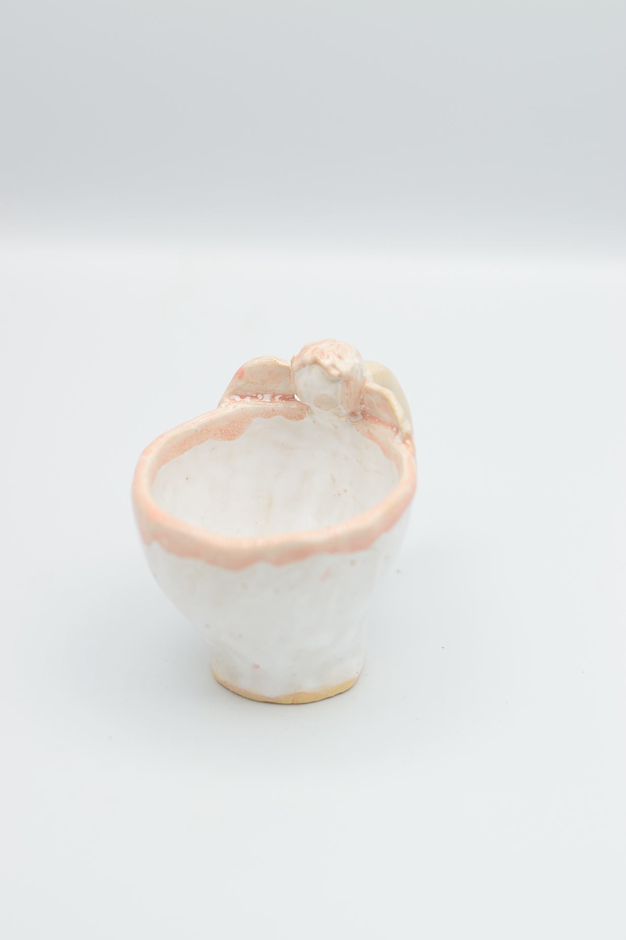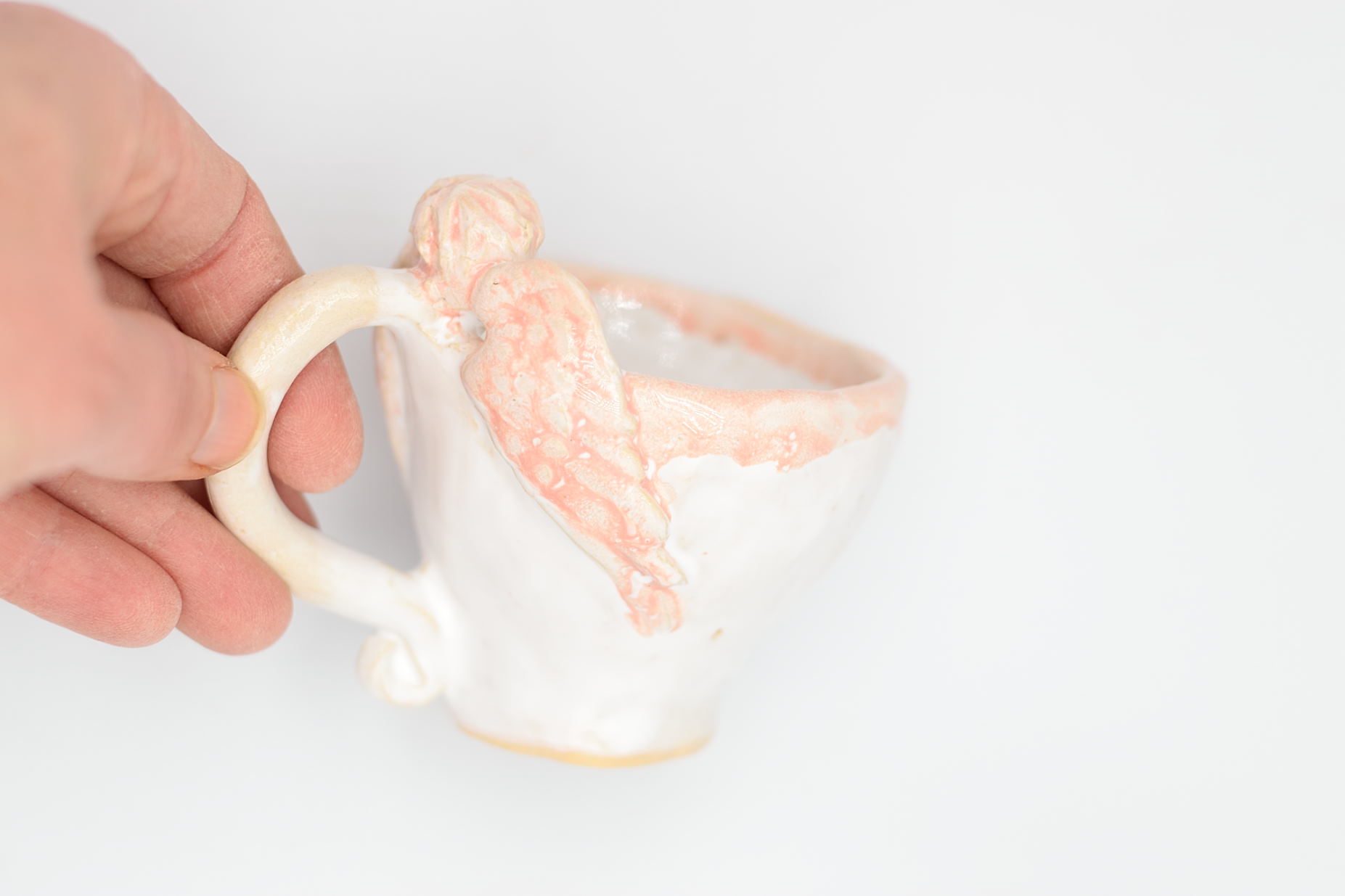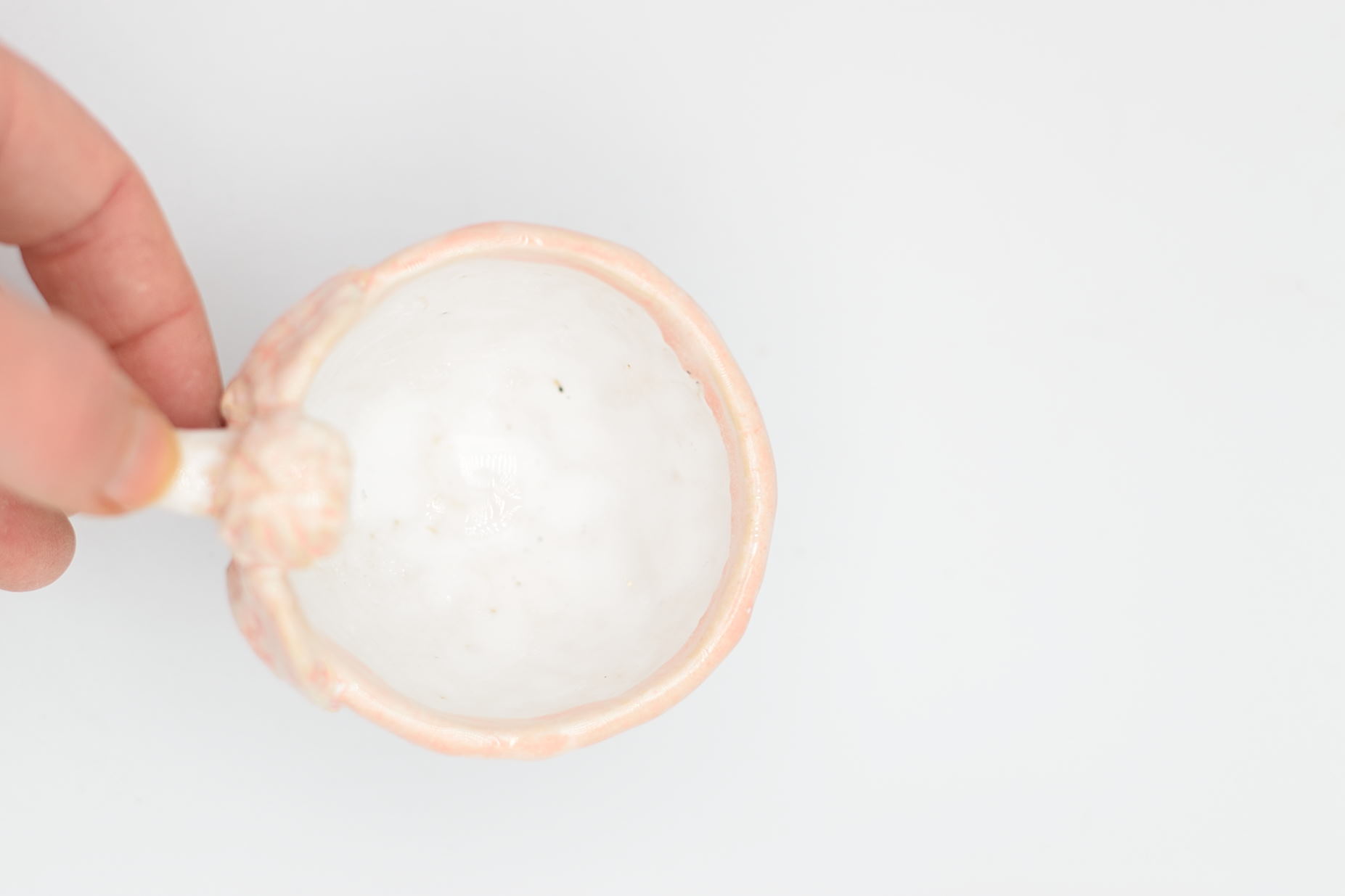 Kubek jest ręcznie formowany z gliny, co sprawia, że każdy egzemplarz jest niepowtarzalny. Różowa kolorystyka w połączeniu z motywem skrzydeł nadaje mu lekkości i symbolicznego charakteru – wolności, spokoju, uważności.
