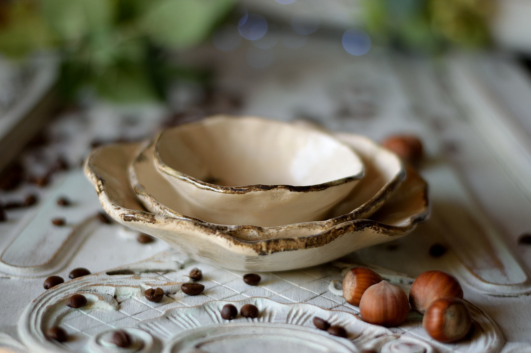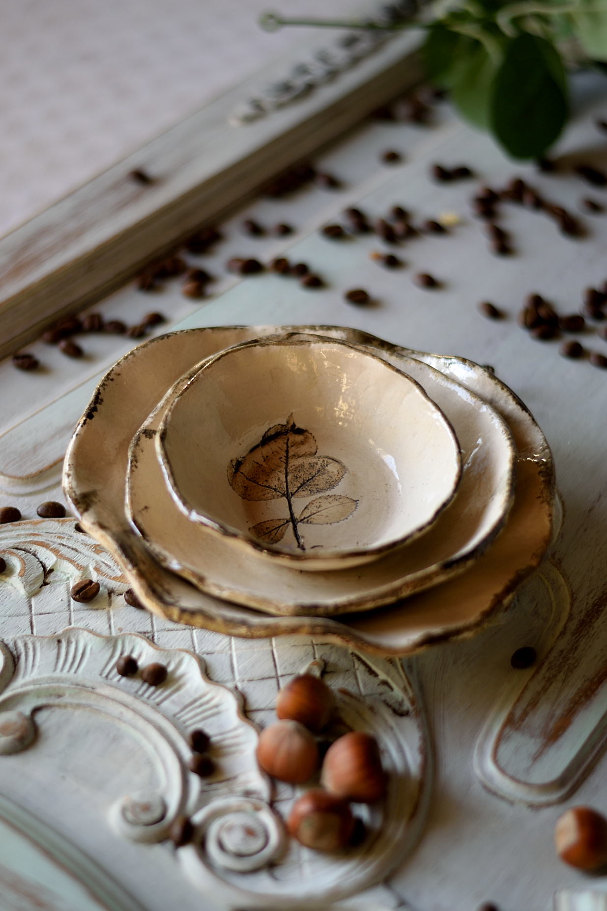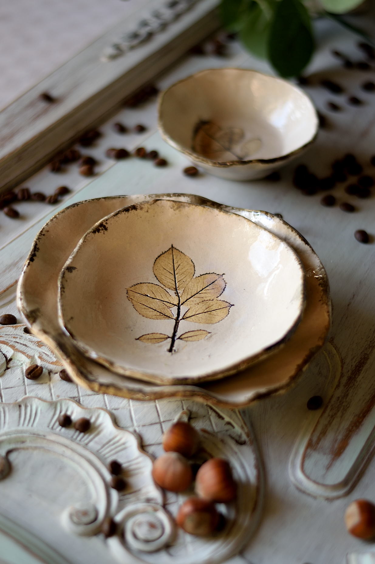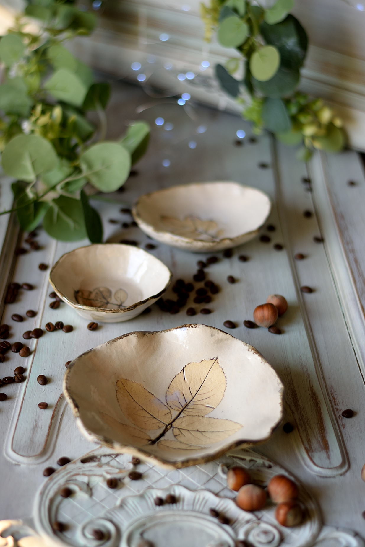 Odkryj wyjątkowy zestaw trzech ręcznie wykonanych miseczek ceramicznych, w których zapisałam wspomnienie lata. Delikatne liście róży subtelnie odciśnięte w glinie nadają każdej miseczce niepowtarzalny charakter. Naturalna, zgaszona biel podkreśla elegancję i subtelność formy, tworząc harmonijną całość.